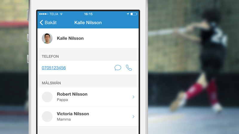 Du hittar enkelt kontaktuppgifter till alla föräldrar i mobilappen. På så sätt kan du exempelvis höra med Antons pappa om han ska skjutsa till nästa match.