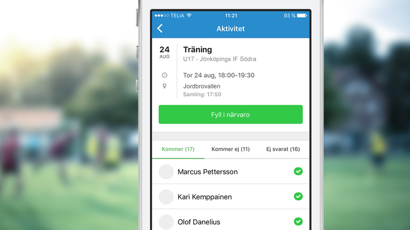 I mobilappen kan du snabbt se vilka som kommer på nästa träning.