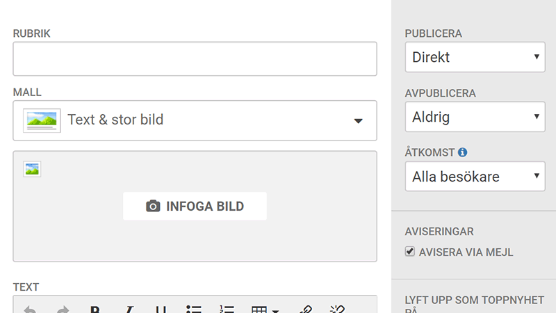 Bilder laddas upp direkt i nyheten och skalas automatiskt om till rätt format vilket medför kortare laddningstider på sidan.