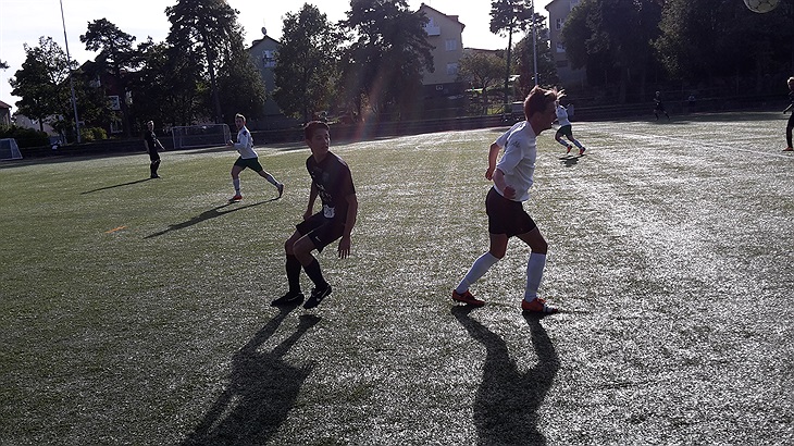 Matchen börjar och inget lag tar direkt tag i spelet ordentligt trots att det blir farligt åt båda hållen efter lång och krossbollar. Inget skönt passningspel att tala om. Vi får en straff efter en situation där Snipers vill få det till att TT först stod offside innan han görs ner i straffområdet. Jag tycker han står rätt stabilt brevid sin mittback, men jag ser det hela från mittlinjen så det är svårt att veta. Straffen tar hursomhelst TT själv och han slår den till höger och Snipers målvakt är på den innan den rullar in i nätet. 1-0 och vi kan spela lite mer avslappnat. Jag tycker matchen ändå fortsätter som innan utan att vare sig vi eller Snipers har nåt direkt spel att tala om, det blir mest långbollar som blir farliga och en del kamp på mittplan. Vi kan göra 2-0 också genom TT efter pass från Robban. Och nu mot slutet känner jag ändå att det är vi som tagit över spelet även spelmässigt.
