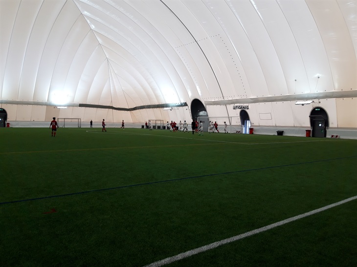 Vi spelar i Nacka i ett tält som nog är skönare att spela fotboll i nån gång i februari än i maj. Luften är kvalmig och det är lite bastukänsla över det hela. Därav blir det många korta byten på våra spelare som måste pusta då och då.