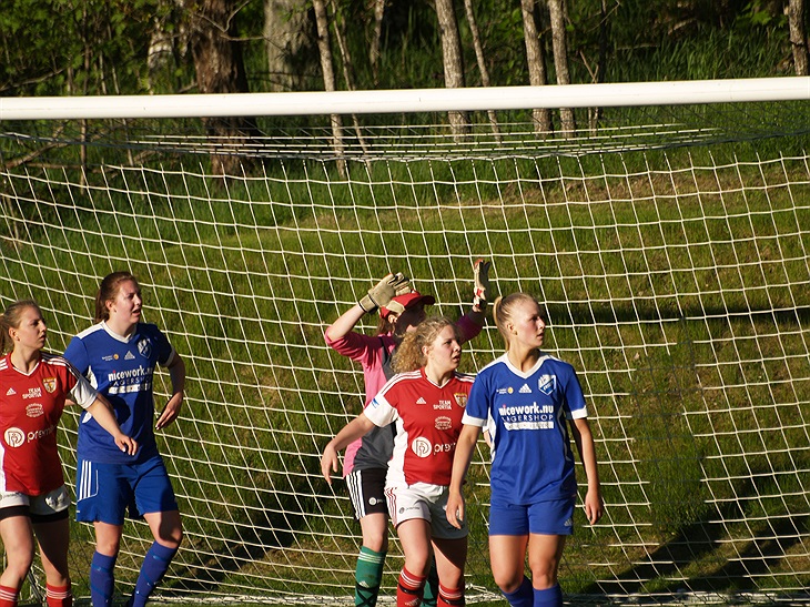 och vinner lite mer boll på mittplan vilket ger oss chans att skapa lägen framåt där Fridas skott i 70:e minuten stryker tätt över ribban och Alice har även hon ett bra skottläge i 80:e men hemmalagets målvakt är på allerten och avärjer.