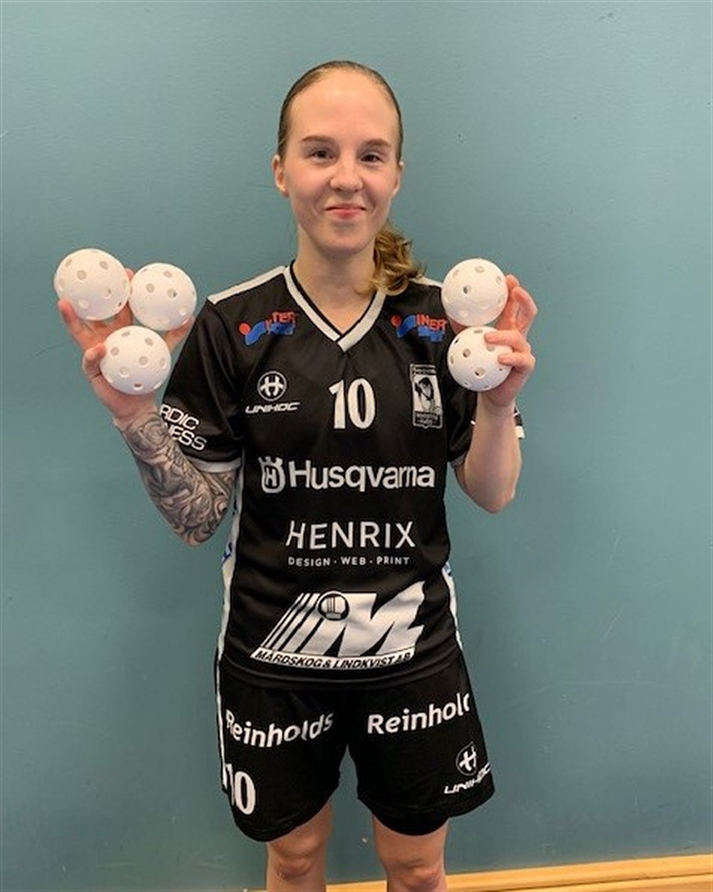 Första vänder hon bort back, skjuter i krysset. Sedan så drar hon in bollen i bortre gaveln efter ett frislag (ass namne Hanna) där motståndarna stått för nära men det struntade hon i. Sedan blir hon själv serverad en smörpass av Alva som friställer henne med målvakt där hon inte gör något misstag. Sista målet kommer strax efter, serverad av Sjöa för andra gången och hux flux så står det 7-2 på tavlan. För att krydda rätten extra starkt så lägger hon en macka diagonalt framför mål där Sjöa tackar för bjudningen och rakar in sista delikatessen fram till 8-2 och slutresultatet. Wow!