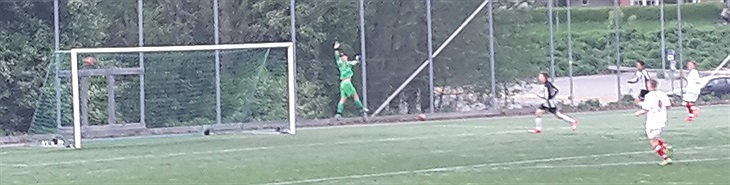 Andra startar och det tar inte lång tid innan Jonte på nytt gör ett riktigt drömmål. Fint samspel från mitten ger Jonte ett hyfsat läge men ändå rätt djupt ner och ut på högersidan i straffområdet. Han får till en bra träff och bollen går som en projektil över målvakten och in i bortre krysset, se bilden. Matchen fortsätter i samma anda, bägge lagen lägger större energi i anfallet än på att försvara sig känns det som och målen trillar in med jämna mellanrum. Till slut är vi uppe i 7-4 då domarens pipa ljuder för full tid. Riktigt skönt med tre helt rättvisa poäng igen och vi börjar kännas som ett etablerat mittenlag i serien nu. Bara att fortsätta jobba oss uppåt så kan det bli riktigt bra det här.