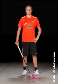 Orange matchtröja, svarta adidas shorts, svarta bodywell strumporna, vattenflaska och glasögon.