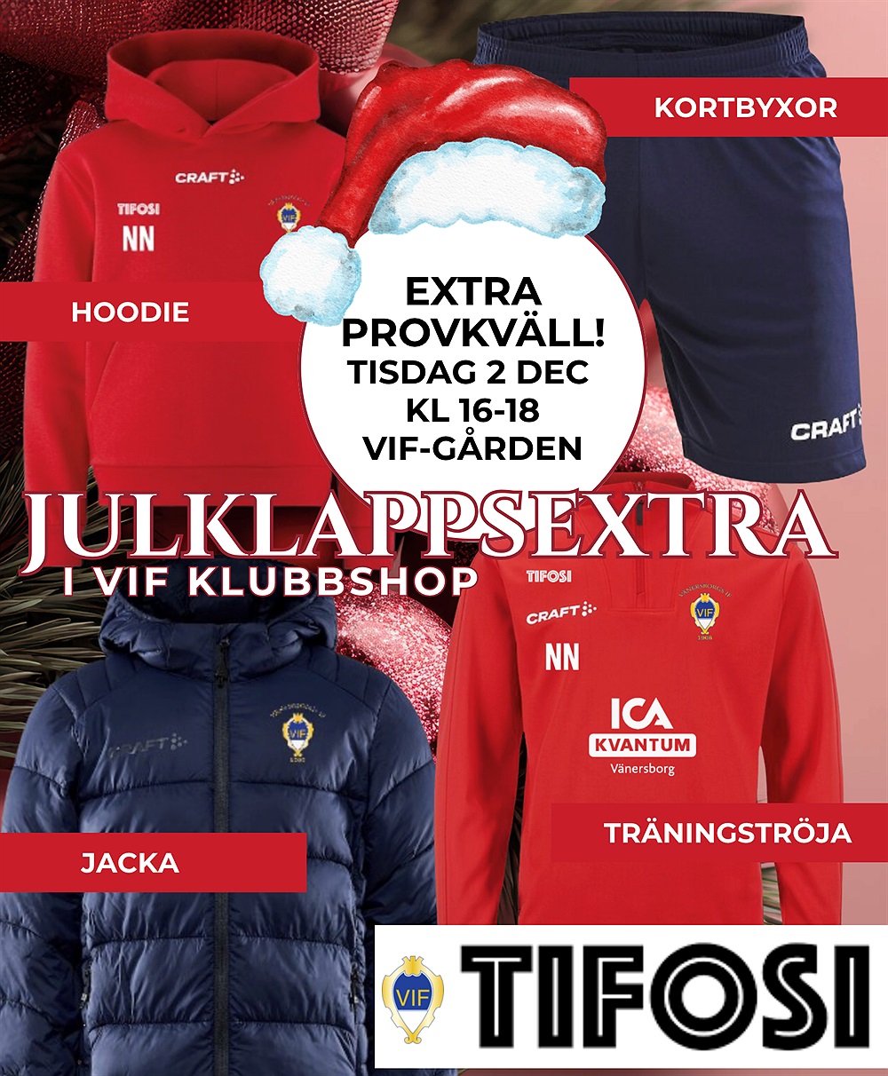Många vill fixa rödblåa julklappar och för att vara säker på att det blir rätt storlek kommer vår samarbetspartner TIFOSI till VIF-gården tisdag 2 december kl 16-18 för en extra provkväll av VIF-kollektionen.