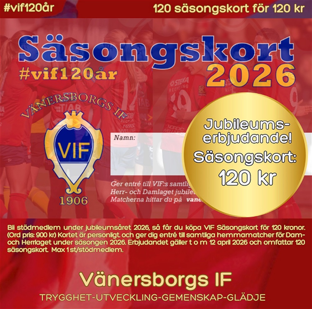 JUBIEUMSKAMPANJ! Som VIF stödmedlem 2026 får du köpa VIF Säsongskort 2026 för endas 120 kr. Ord pris: 900 kr Du får också 25 % rabatt på gymkort hos VIF:s Huvudpartner Nordic Wellness och flera andra förmåner som medlem.