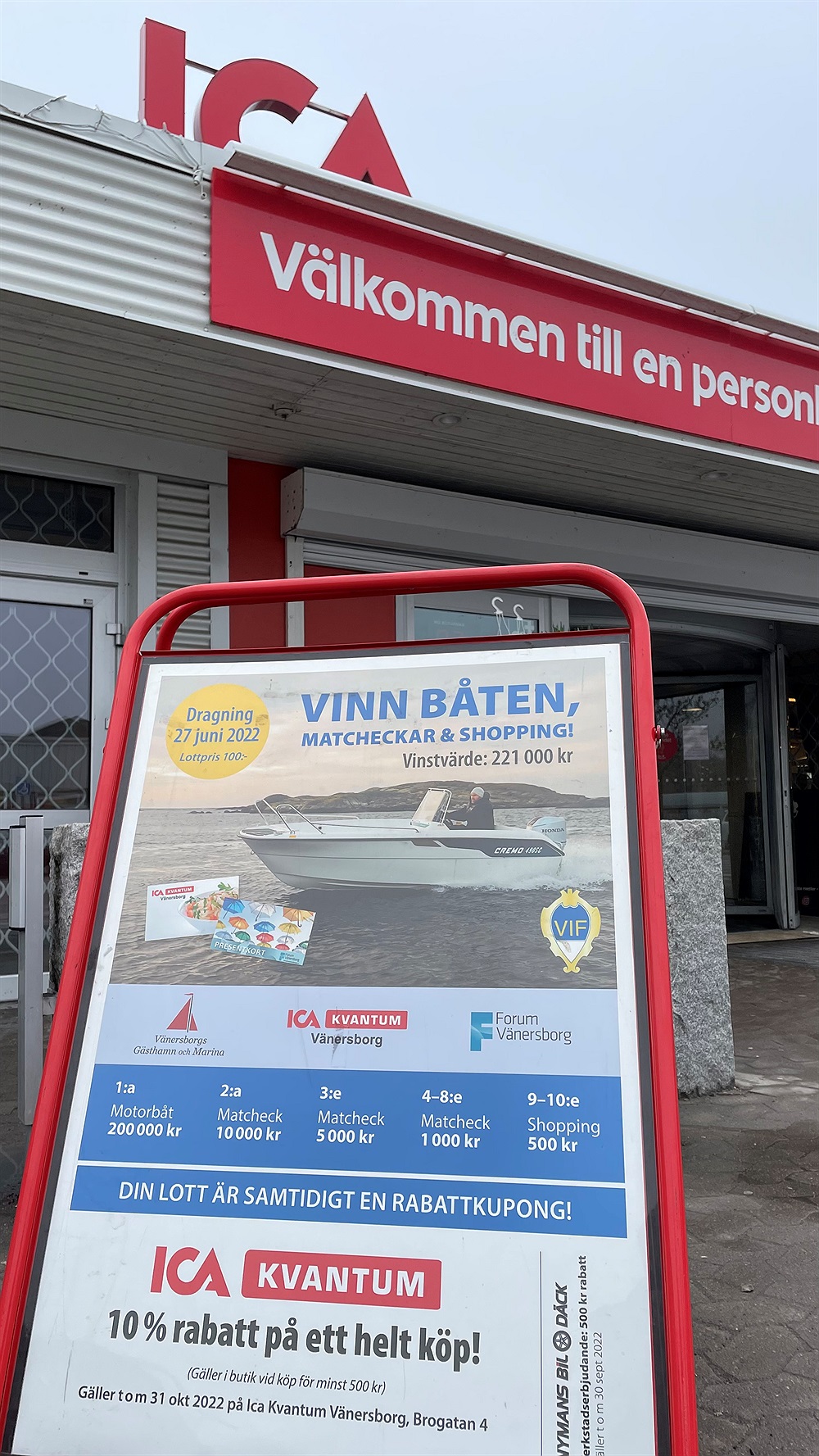 Nu är säljskylten för Båt- och Matlotteriet på plats utanför ICA Kvantum.