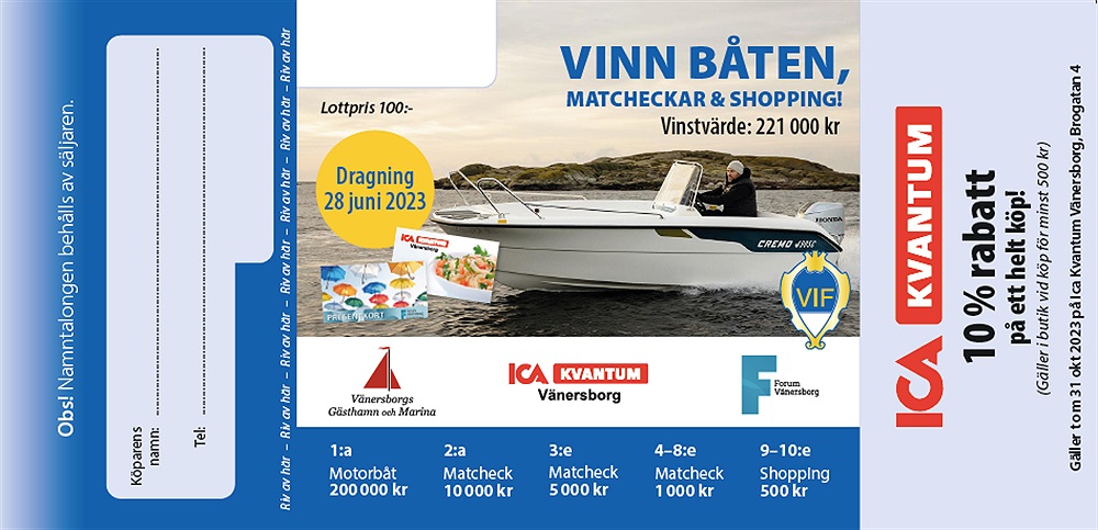 Liksom tidigare ger lotten 10 % rabatt på ICA Kvantum fram till 31 oktober 2023 vid köp över 500 kr. Även i år ger lotten också 500 kr i rabatt hos Nymans Däck & Bil när du bokar service eller reparation senast 30 september 2023 och kostnaden överskrider 2500 kr. Och inte nog med det: 100 kronor i rabatt får du med lotten när du handlar för 1000 kr hos båtleverantören Vänersborgs Gästhamn & Marina senast 30 sept 2023, dessutom. En vinstlott på alla sätt, med andra ord! Tack till våra lottpartners!