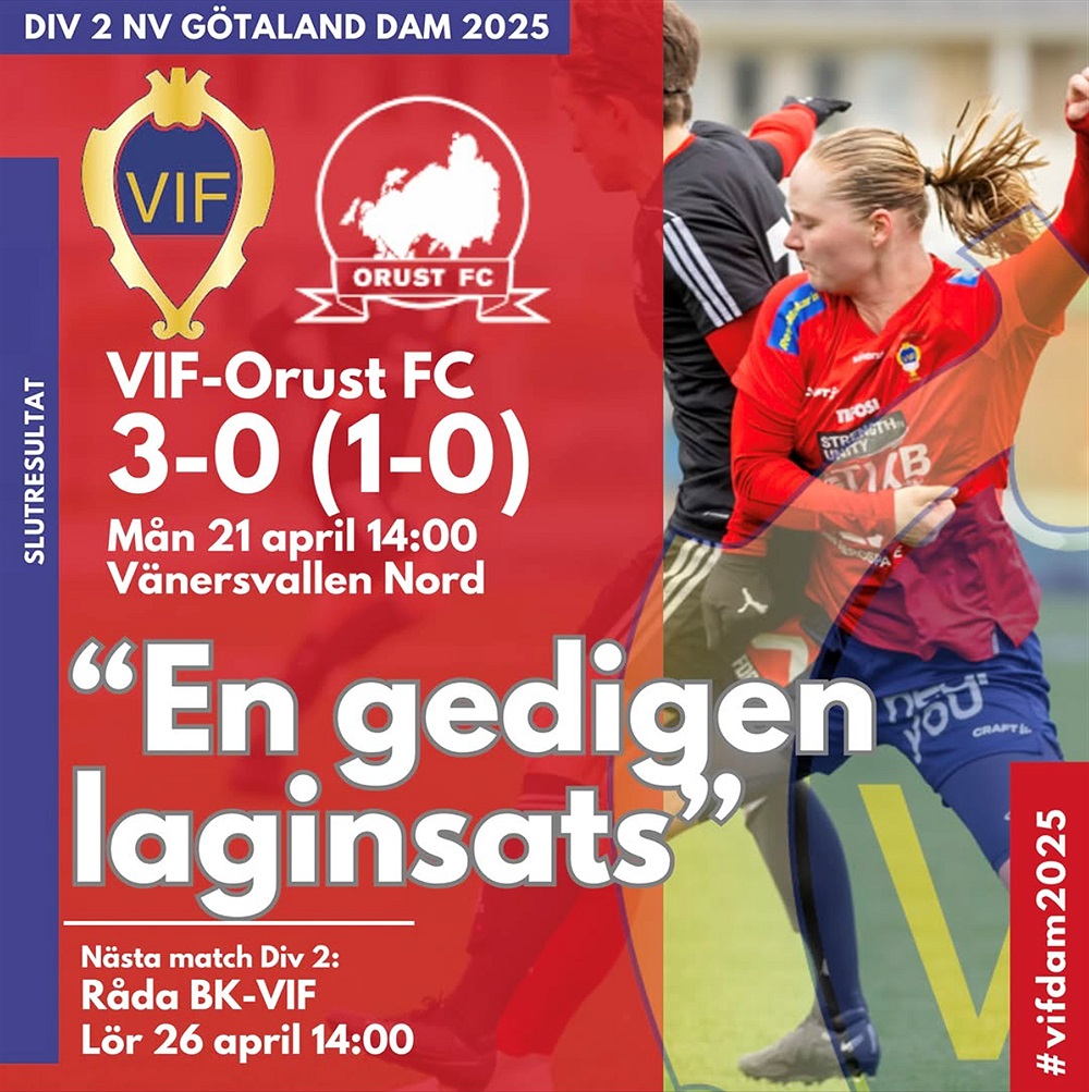 Efter paus har VIF bättre kontroll, men Orust är fortfarande farliga och en ettmålsledning är alltid bräcklig. Därför var det onekligen skönt, med hemmaögon sett, när Josephine James Tisell stänkte in 2-0 med kvarten kvar och strax därefter punkterade Elin Leijon matchen när hon tryckte in sin egen retur på Liv Ydréns fina hörna. Tre välförtjänta poäng till VIF som börjat seriespelet med två insatser där lagarbetet stått i fokus.