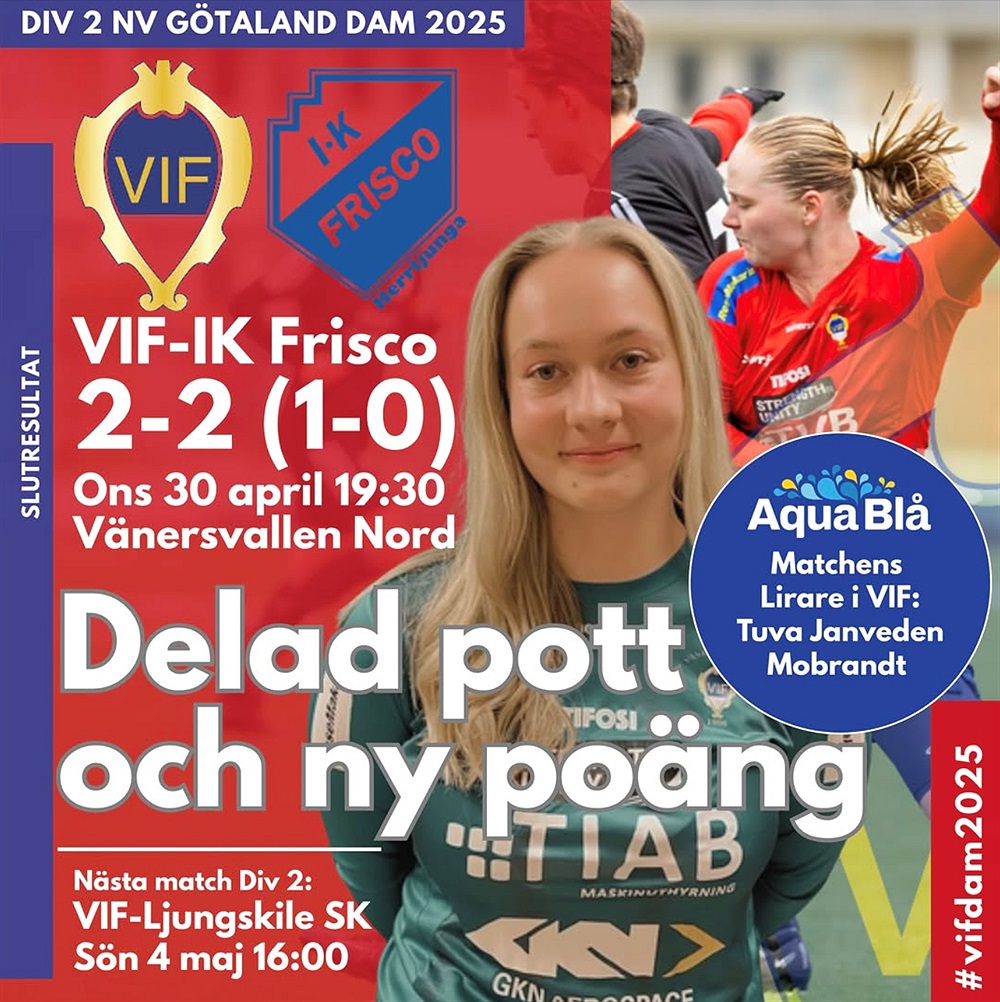Målvakten Tuva Janveden Mobrandt utsågs till matchens lirare i VIF. Ny chans till tre poäng redan på söndag 4 maj då fjolårets div 1-lag Ljungskile SK gästar Vänersvallen Nord i ett högintressant derby! Avspark 16:00.