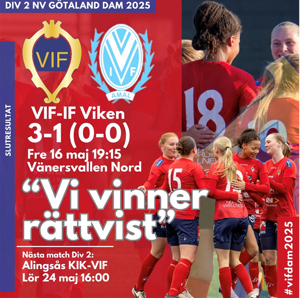 Hemmalaget spelade riktigt bra under första halvlek, men målen dröjde till minut 80 innan comebackande Wilma Holmberg Larsson kunde spräcka nollan. Därefter blev det händelserikt med ytterligare mål för VIF och reducering för Viken. Dramatik ända in på övertid, men till slut kunde hemmaspelarna jubla. - Jag är väldigt tillfreds med första 45. Där tycker jag vi har full kontroll på matchen och styr händelserna. Det enda som fattades var väl egentligen skärpan i sista passningen. En riktigt bra halvlek kort och gott, säger tränare Anders Dahlgren. Efter paus blev det något av en scenförändring, då Viken klev upp med fler spelare.