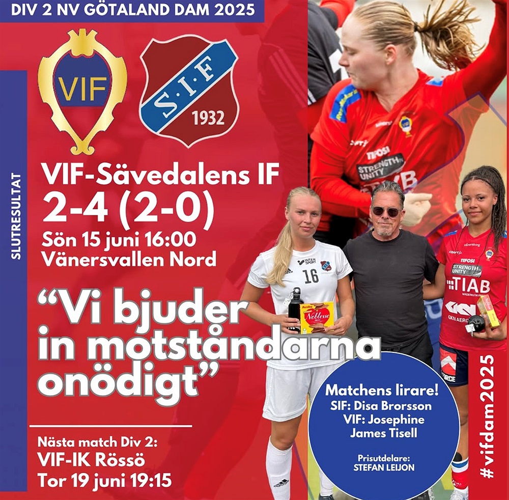 VIF:s damer föll i söndagens hemmamöte i Division 2 med Sävedalen, efter en tuff batalj där poängen fanns inom räckhåll. Gästerna vände och vann sedan rödblått haft 2-0-ledning i paus. Josephine James Tisell svarade för fullträffarna, båda gångerna assisterad av Linnea Noord. Huvudtränare Anders Dahlgren var besviken efter matchslut.
