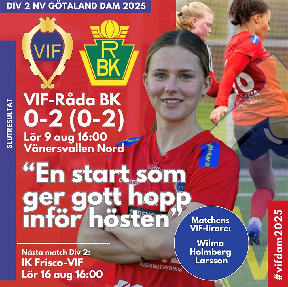 Gästerna gjorde mål redan i den första halvlekens 8:e och 19:e minut, men därutöver var det tämligen ont om klara målchanser för topplaget. VIF bjöd på en samlad defensiv och offensivt fanns möjligheter under matchen men ett stabilt och resolut Råda höll tätt bakåt. - Vi möter ett väldigt gediget lag som toppar tabellen, men ser till att ge dem en match i 93 minuter. Det tar vi med oss som positivt, säger tränaren Anders Dahlgren.