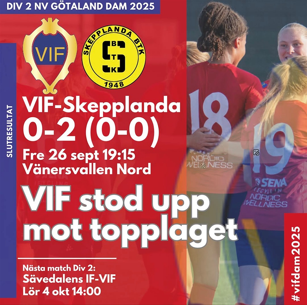 VIF Dam gjorde en stark insats i sista seriematchen på hemmaplan i Division 2-spelet, men föll trots det mot topplaget Skepplanda på fredagskvällen. Ställningen var 0-0 i paus efter en halvlek där gästerna varit spelförande och skapat mest, men där VIF jobbat hårt och laglojalt och skapat ett par vassa lägen. Bland annat var Isabella Lundberg framme och avslutade på Linn Häggs precisa djupledsboll, men SBTK-målvakten räddade med en benparad.