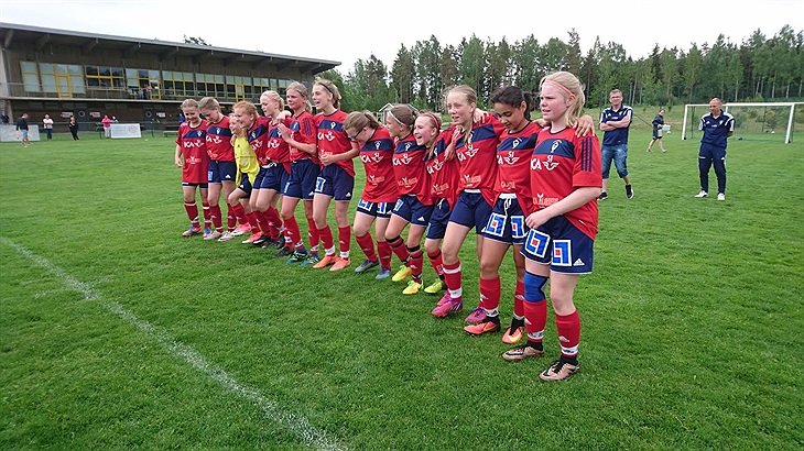 Framåt fick vi se fyra intressanta mål. Det första knäar Emma in efter att vi kommit runt bra på högerkanten där Agnes bidrog med flera farliga inspel. Emma, forward för dagen, såg till att vara på rätt plats vid rätt tillfälle. Vårt andra mål är en hörna från Nora som mycket elegant skruvas direkt in i bortre gaveln. Tredje målet är en rejäl inspark (!) från Nellie som går över hela planen och letar sig in i mål. Emma var framme och störde försvarare och målvakt och kanske fick hon även en touch på bollen. Det avslutande fjärde målet är en pärla. Johanna kliver fram och vinner en duell högt i banan, bollen hamnar hos Ebba A som avancerar och avslutar med ett fint skott från distans.