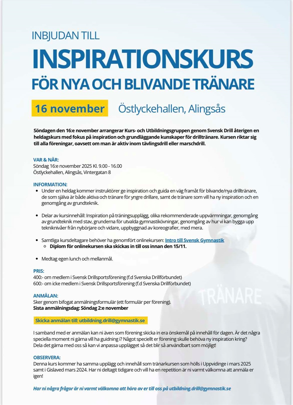 Den 16 november anordnar utbildningsgruppen i drillförbundet en kurs för nya och blivande drilltränare i Alingsås, se bifogad bild. En jättenyttig och bra kurs som Tove och Sara Persson håller i! Föreningen betalar avgiften för alla nuvarande tränare samt för de som är intresserade av eller nyfikna på att bli tränare i framtiden. För att vara med behöver man ha fyllt 13 år och genomfört onlinekursen Intro till svensk gymnastik (tar ca 2-3 timmar, är gratis och kan göras när som helst). Vill ni anmäla er gör ni det till Elin Larsson senast den 1 november!