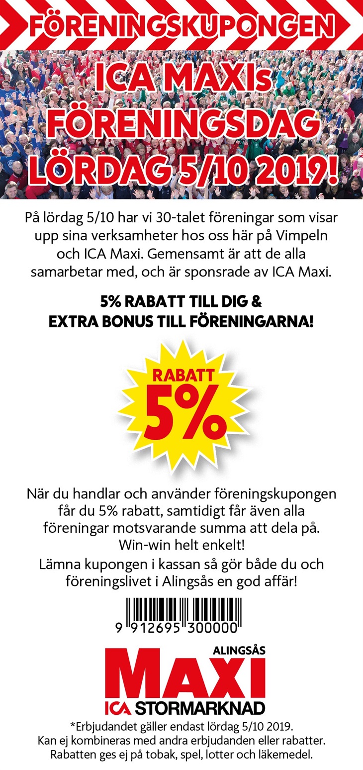 Nu på lördag är det föreningsdagen på ICA-Maxi och det innebär att alla föreningar i hela Alingsås är inbjudna till ICA-Maxi för att visa upp sina idrotter och samtidigt dela ut kuponger som kunderna handlar för i butiken. Sedan får alla föreningar dela på 5 procent av allt som handlats med kupong den dagen på ICA Maxi!