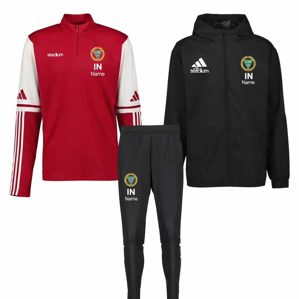 Spelarens initialer trycks på träningsjackan/överdelen samt regnjackan.