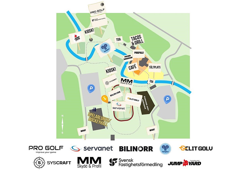 - Vi kommer ha ett blått tält uppställt vid markering Tältplats. Det kommer sitta skylt uppsatt med P18.