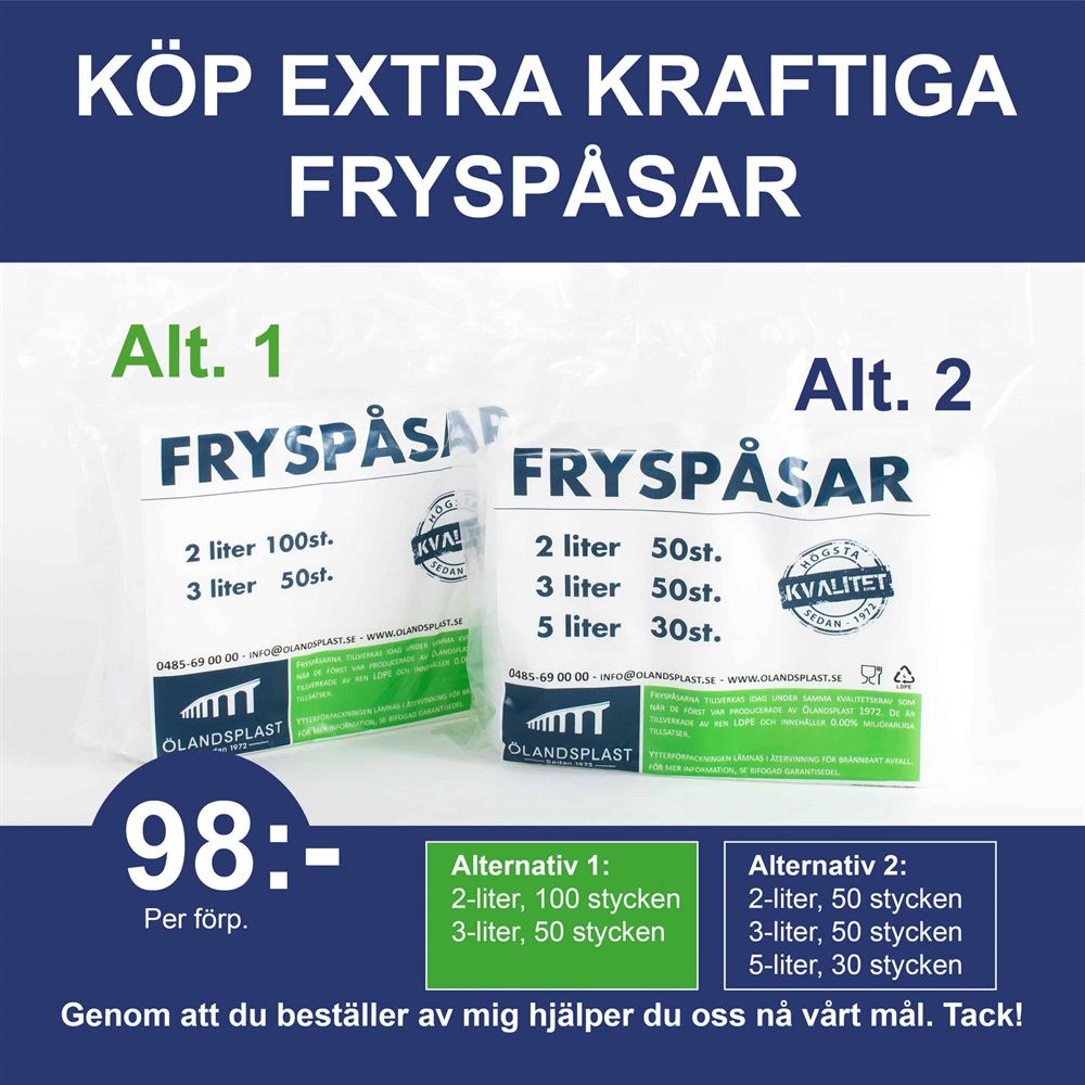 Som en möjlighet att finansiera betinget erbjuder vi nu försäljning av fryspåsar från ölandsplast. Påsarna kommer i två olika förpackningar, varje förpackning kostar 98 kr st. Vi som lag måste sälja minst 50 st förpackningar totalt .