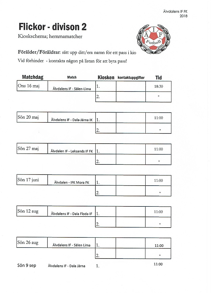 Här kommer ett arbetschema där ni kan önska ett datum som passar er bäst. Kommentera nedan önskat datum så fyller vi i rutorna och lägger ut det på nytt när alla rutorna är tilsatta så att man enkelt kan gå in och kolla vilken dag man står i kiosken under tjejernas matcher. Datum som ej är tilsatta fredagen den 18 maj fyller klubben i med namn som saknas i kommentarsfältet.