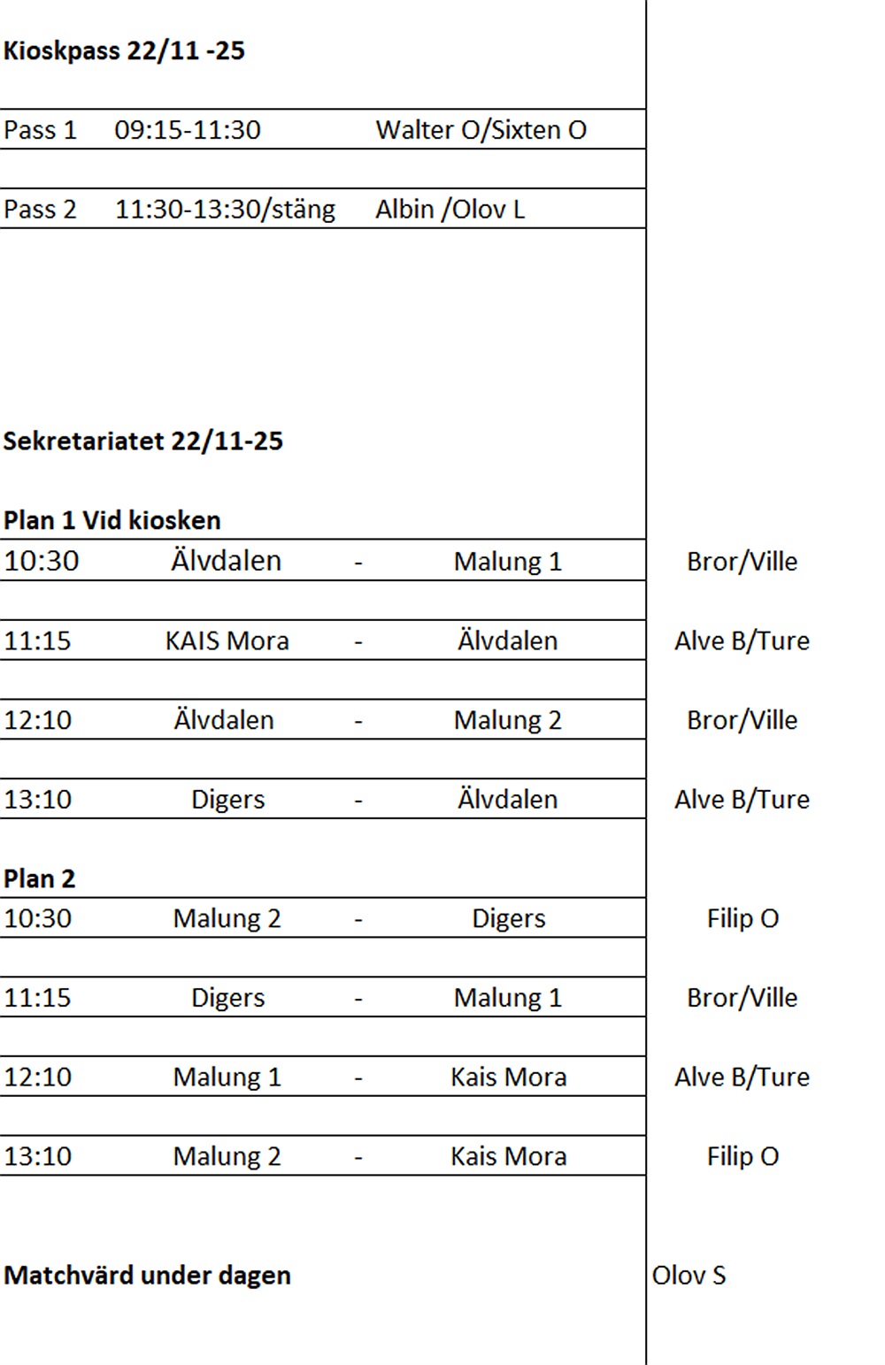 Spelschema och vilka arbetspass alla har ser ni på bifogad bild.
