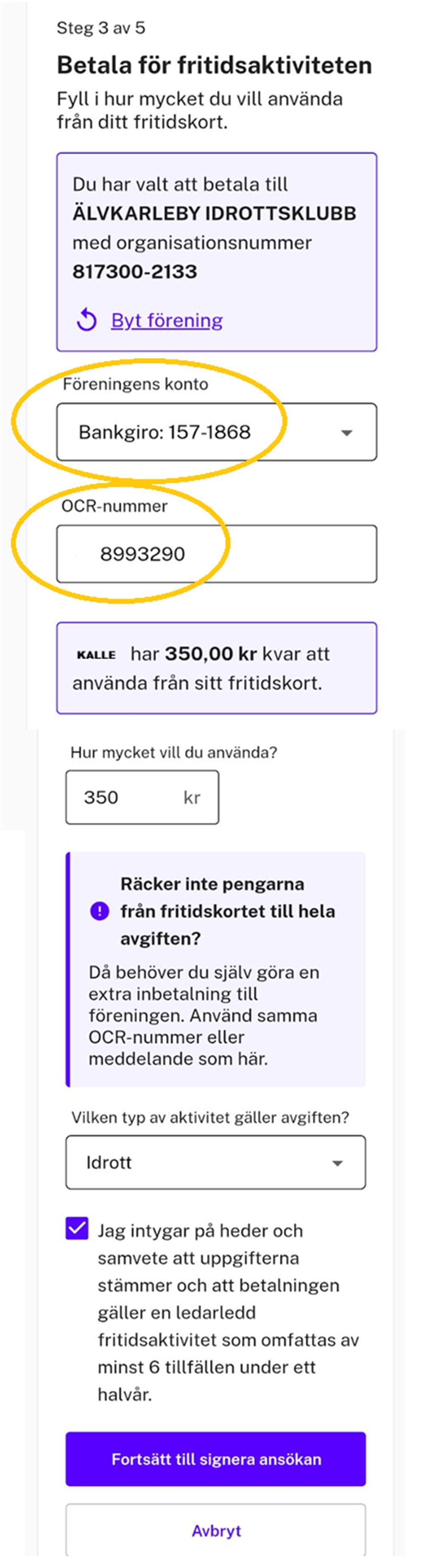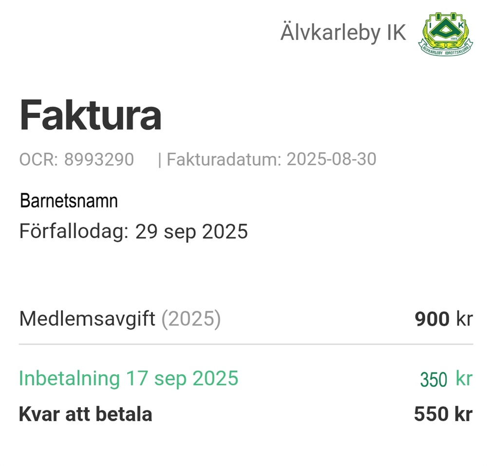 Om pengarna inte täcker hela avgiften för fritidsaktiviteten behöver du göra en extra betalning till samma OCR-nummer med det resterande beloppet så vi får betalt för hela avgiften. Finns det pengar kvar kan du betala för fler fritidsaktiviteter. Dock så tar det 2-3 bankdagar innan avgiften på fakturan i Svenskalag uppdateras.