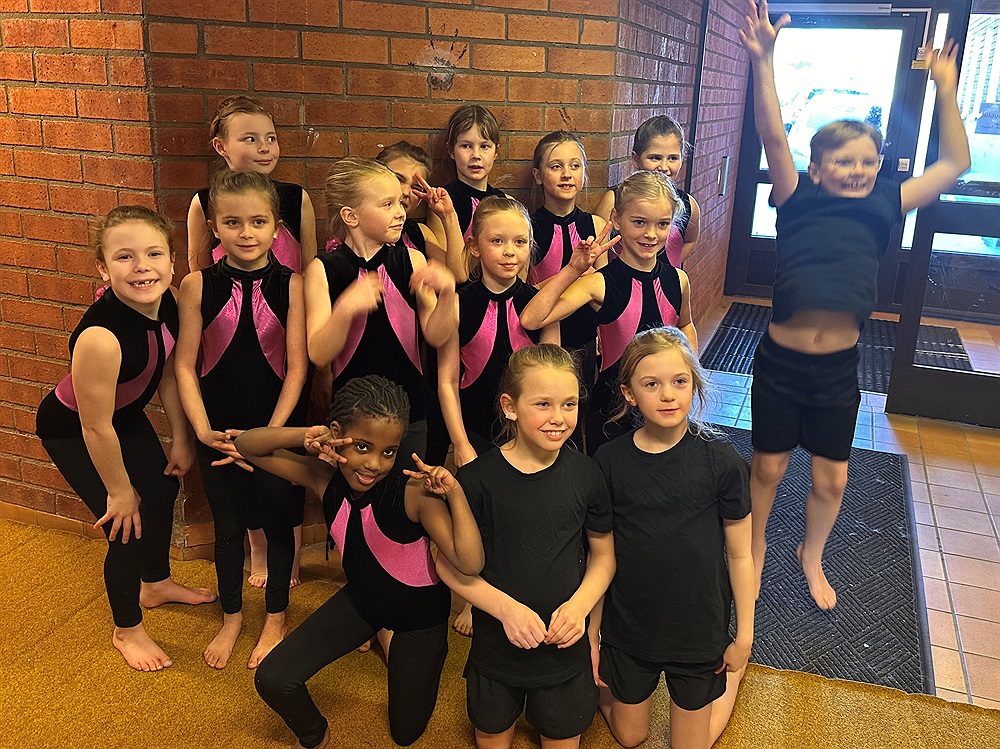 Vi har roligt tillsammans och tränar för att delta på regionala tävlingar i truppgymnastik i både redskap och fristående (dans).