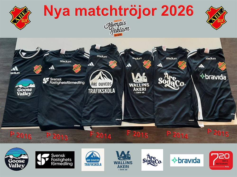 Vi har fortfarande 2 matchställ á 22 tröjor som saknar sponsortryck (för våra 8-åriga flickor och pojkar som spelar 5 mot 5 i år). Vill du sponsra ett matchställ? 5000 kr inkl. mag/brösttryck på 22 tröjor. Kontakta kansliet@are-slk.se