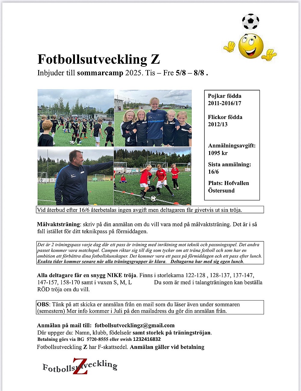 Fyra dagar fyllda av utvecklande fotbollsglädje tillsammans med gamla och nya kompisar i en rolig och trygg miljö. I anmälningsavgiften ingår hoodie, t-shirt, gympapåse och utvecklande träning tillsammans med erfarna tränare och fd elitspelare.