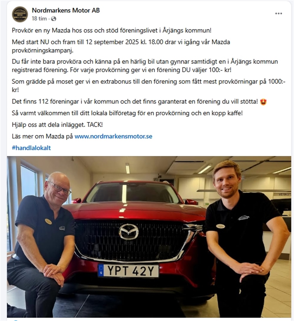 Stöd ÅIF och provkör nya Mazda hos Nordmarkens motor. För varje provkörning vi gör får föreningen 100 kr. Skulle ÅIF ha mest provkörningar får vi ytterligare 1000 kr.