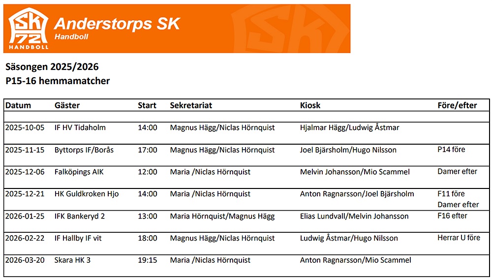 Här finns schema för bemanning av killarnas hemmamatcher denna säsong.