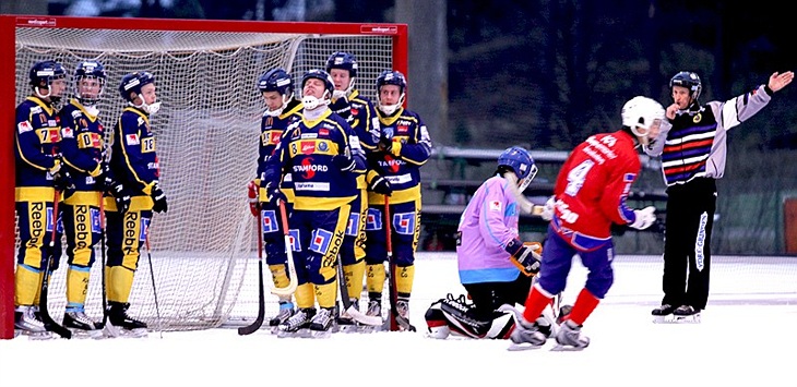Båda lagen börjar de första minuterna lite avvaktande där motståndarna kommer till första avslutet, utanför... puh. I slutet av andra minuten drar vi upp bollen på vänsterkanten och slår en flipp fram mot VG. En av backarna kommer dock emellan men lyckas inte få bort bollen och den studsar fram till Oskar Nilsson. Han kliver runt ut mot hörnflaggan och skapar vår första hörna. Kjellberg får till ett bra inslag och Lindén ett kanonskott som sitter i nättaket. Riktigt skönt!! Allt känns mycket lättare och nervositeten släpper lite när man tar ledningen. Efter det växlar spelet fram och tillbaka utan några riktigt vassa målchanser. Vi missar lite i styrspelet efter sex minuter och BolticGötas rutinerade norrman Pål Hansen kliver igenom vår styrning. Han sätter en djupledspassning mellan våra backar, forwarden som kommer i full fart rundar både vår libero och målvakt, 1-1. Lite surt men grabbarna tappar inte sugen och vi fortsätter att släppa bollen till spelare i fart vilket resulterar i en straff till oss efter femton minuter. Lindén kliver fram och sätter den.... i ribban. Vi fortsätter att släppa boll och håller bra fart på rören. Diagonalåkningar med urvändningar skapar ytor för djupledspass. I mitten på halvleken drar Yurij upp ett anfall från sin vänsterkant, han släpper den till Oskar Nilsson som trycker på i skridskoåkningen förbi ett par motståndare. Hans pass till Marcus Lantz som störtar fram på ytterkanten sitter perfekt, Marcus är säker och lägger bollen på isen bredvid målvakten. Vi har ledningen igen!!! BolticGöta viker inte ned sig och efter en liten miss i styrspelet igen får vi en utvisning på Jesper Åkerlund för fasthållning. Alla i laget vill dock spela bandy den här dagen så vi lider inte nämnvärt av att vara en man mindre på banan. Yurij drar upp ett anfall i 37:e minuten. Han dribblar av flera motståndare och tar sig hela vägen ner till kortlinjen på högerkanten. En back kommer till slut i vägen och vi får hörna. Återigen träffar Lindén och vi ökar på ledningen till 1-3.