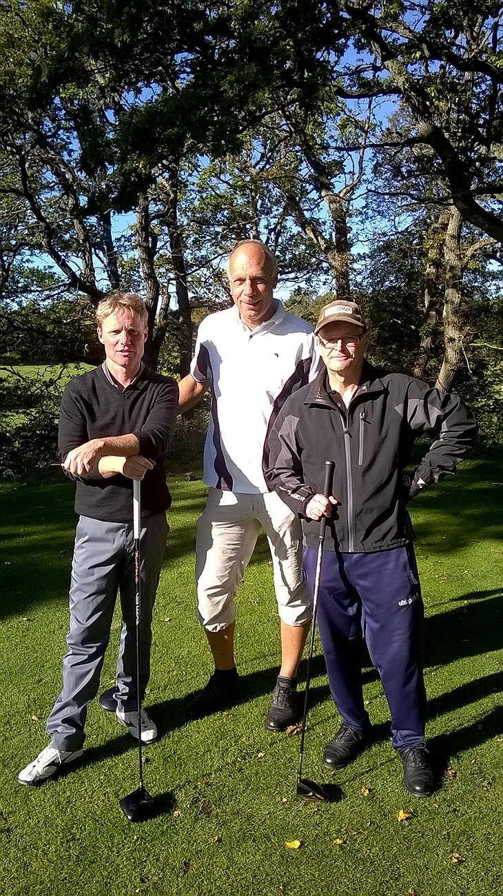 Urban Kjellberg, Kjell Yngvesson och Rolf Kindstedt redo för att slå ut på hål 10