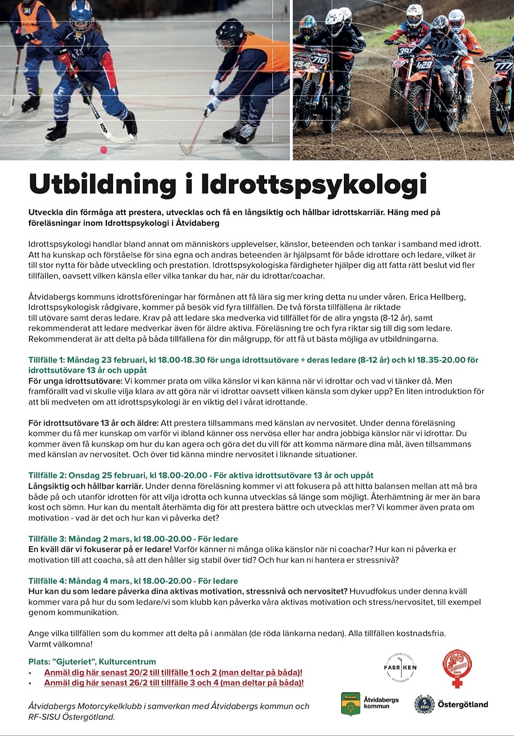 Åtvidabergs MCK bjuder in till utbildning i Idrottspsykologi i samverkan med Åtvidabergs Kommun och RF-SISU Östergötland.