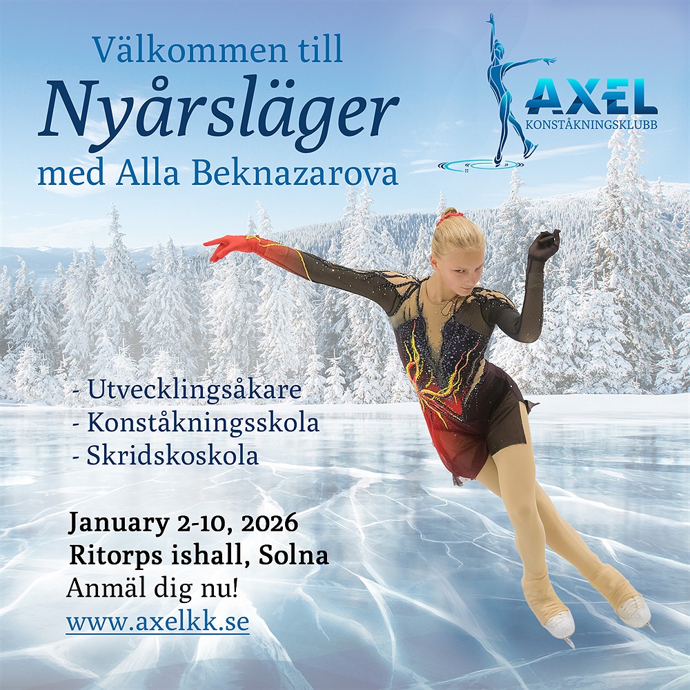 Välkommen på Nyårsläger med AxelKK veckor 1-2 (2-5 och 7-10 januari 2026) för skridskoskola, konståkningsskola, System 1-3 tävlingsåkare i Ritorps ishall, Solna. Speciellt fokus på skridskoteknik, grunderna inom hopp- och piruettteknik.