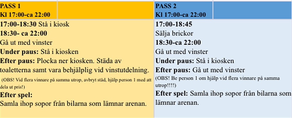 Se info på bilden vad de olika passen innefattar och kommentera nedan om ni kan tänka er att hjälpa till. Samt om ni har önskemål om pass.