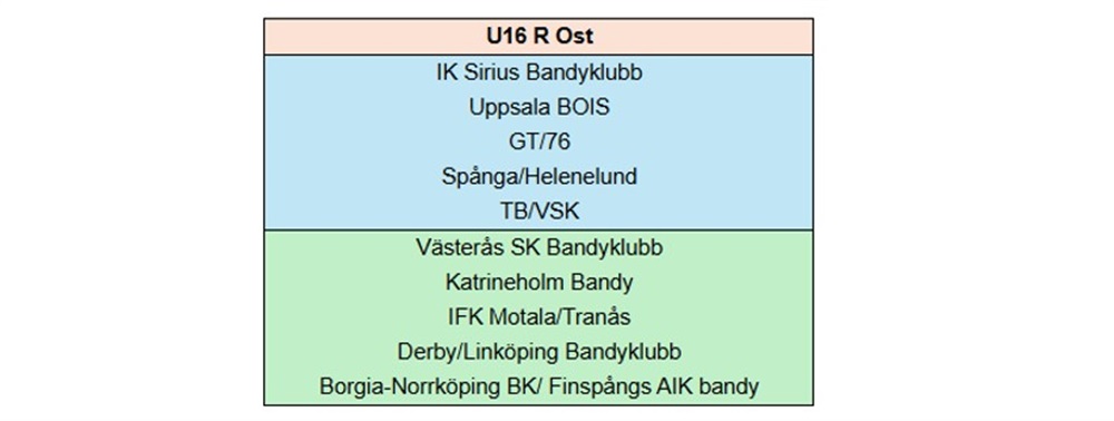 Bandyförbundets tävlingskommitté har uppdaterat serierna för U16 Regional efter att Örebro SK drog sig ur. Serien spelas alltjämt i två pooler (blå eller grön i bilden ovan) där man spelar dubbelmöten inom egen pool och singelmöten mot lag i den andra poolen.