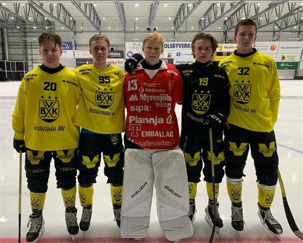 (Övriga spelare på bilden är från höger: Albin Netz, Albin Eek, Wille Pannwitz och Malte Engdahl som också går Bandygymnasiet och kommer att delta i uttagningarna.)