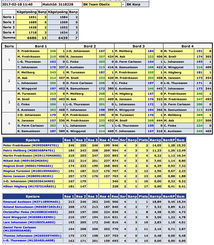 Matchbäst var Emanuel "Lelle" Emanuelsson 213-246-262-245=966. Det är svårt att förstå att Lelle och Finke (830) inte tog mer än en poäng denna dag. Otur verkligen !!!