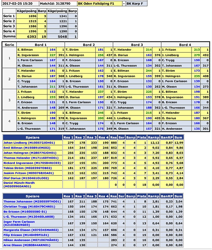 Det blev ett bättre spel i Falköping, utan tvekan, men ärligt talat så kändes det mycket konstigt att det kunde finnas så stor skillnad med lagen i samma serie. Man undrar faktiskt och detta var ett farmarlag... hur ser deras A-lag ut? 6393, jag upprepar 6393 hur är det möjligt att ett F-lag skall kunna ha sådana siffror. Det blir ju spel mot ett mål. Det är inte roligt för någon, inte för Korp-spelarna men inte för hemmalaget heller. Korp blev ju rejält frånåkt direkt. Trots ett lyft med 200+ poäng från matchen i Vara så förlorade Korp F matchen med hela 19-1 och totalslagningsskillnaden blev ca 1350 poäng. Starkt gjort av Crille och Thomas att ta en pinne.