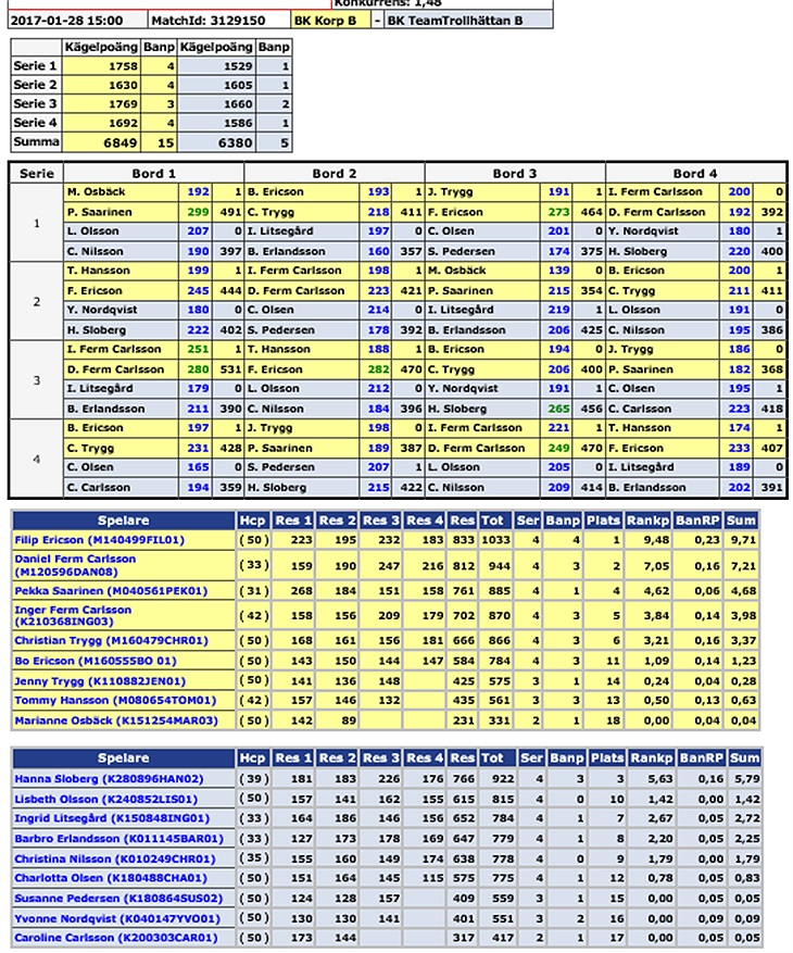 Korp B efter de nyss ha upplevt BK Korp A viktiga vinst mot Kvänums BK ville inte vara sämre. Vart är Korp på väg? Mot toppen säger jag bara. Återigen det märks att väldigt många lägger ner väldigt mycket tid och möda på sin bowling nuförtiden. Det kan naturligtvis inte bli så här bra varje gång men det är Å SÅ VIKTIGT att man kan få uppleva att det är fullt möjligt.