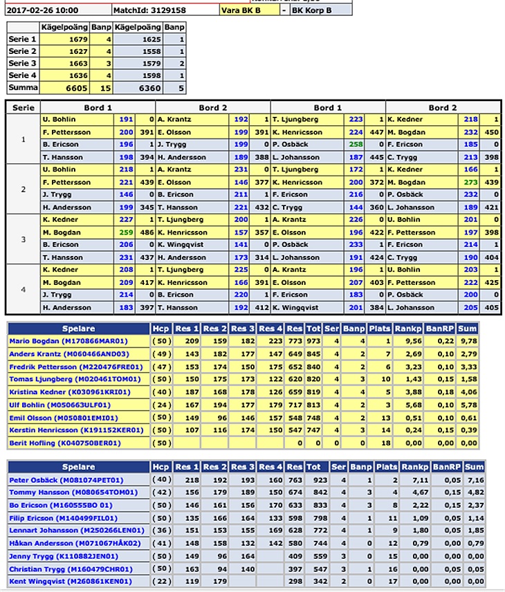 Mario Bogdan i Vara var verkligen på spelhumör. Han var matchbäst med en renslagning på 773 (pers?) och inkl hcp hade Mario 973 poäng. Grymt bra spelat. Peter Osbäck i vårt lag var inte långt efter. Med god marginal var Peter matchbäst i Korp. Peters rad var följande 218-192-193-160=763 (923 med hcp). Peters fina form fortsätter och nu gäller det för flera att hänga på!!!