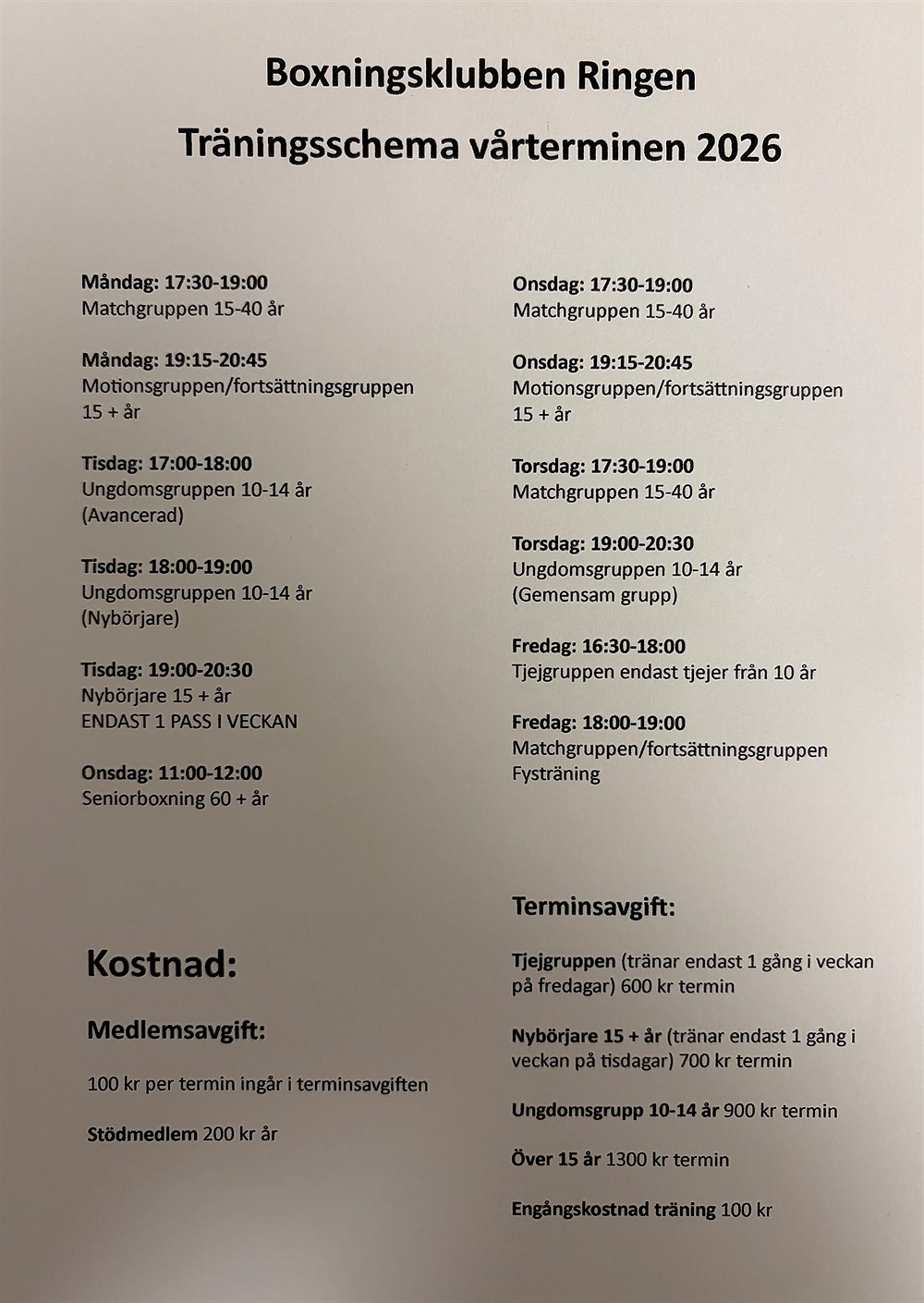 Träningsschema vårterminen 2026 med start måndag 12 januari