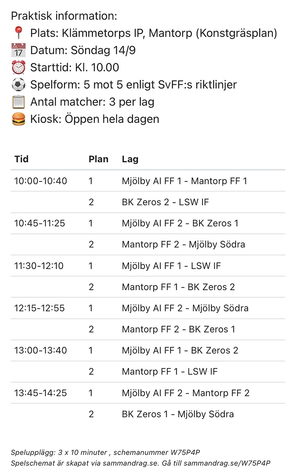 Här kommer info till de som blivit kallade till sammandraget i Mantorp söndag 14/9. Kallelse har gått ut separat. Lagen ser ni nedanför. Vi är dock kort med spelare och kommer låna spelare från de två lagen för att killarna ska orka. Detta innebär att några kommer få spela 4 matcher denna dag. Samling sker 9:30 för samtliga!