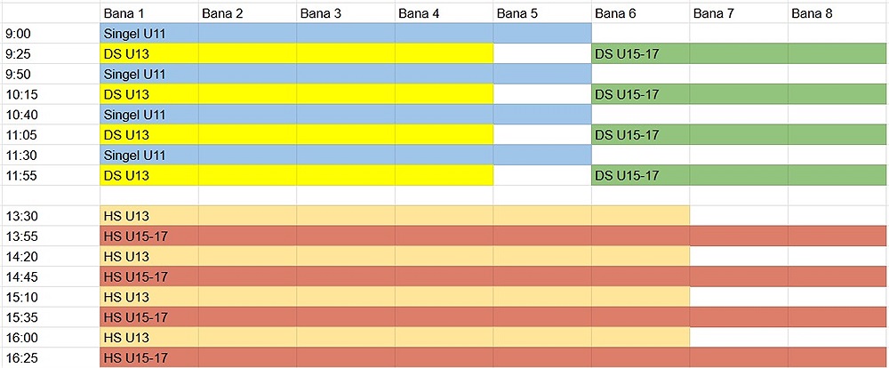 Singel U11, DS U13 och DS U15-17 samlas för registrering 08:30 och sedan är det information och matchstart 09:00.