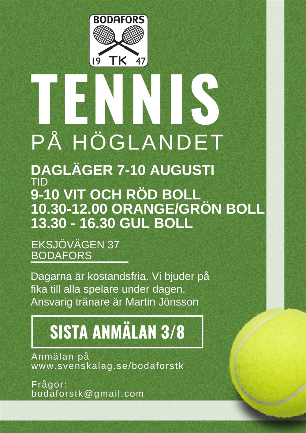 Välkomna på dagsläger i Bodafors för alla tennisklubbar på Höglandet, fyra dagar fullmatade med rörelse, glädje och massor med tennis!