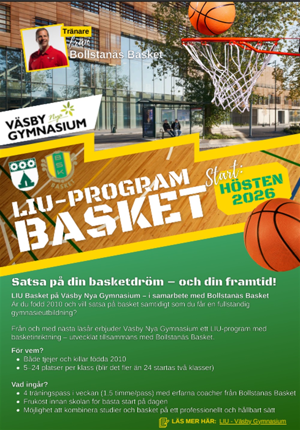 Dags att ta din basket till nästa nivå? Nu har du chansen att kombinera basket och studier på Väsby Nya Gymnasium. VNG är känd för sina förstklassiga idrottsutbildningar inom simning (NIU), triathlon (NIU), hockey (LIU), innebandy (LIU) och fotboll (LIU).