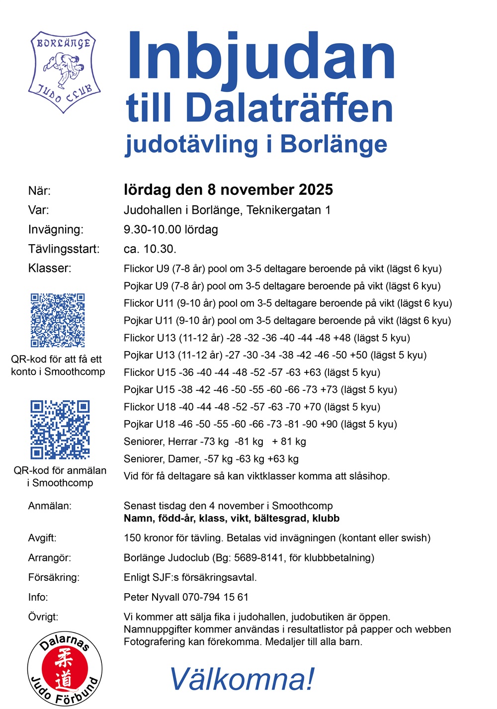 Påminner om Dalaträffen, kom och tävla!Om ni har svårigheter att registrera er vänligen kontakta: info@borlangejudo.se